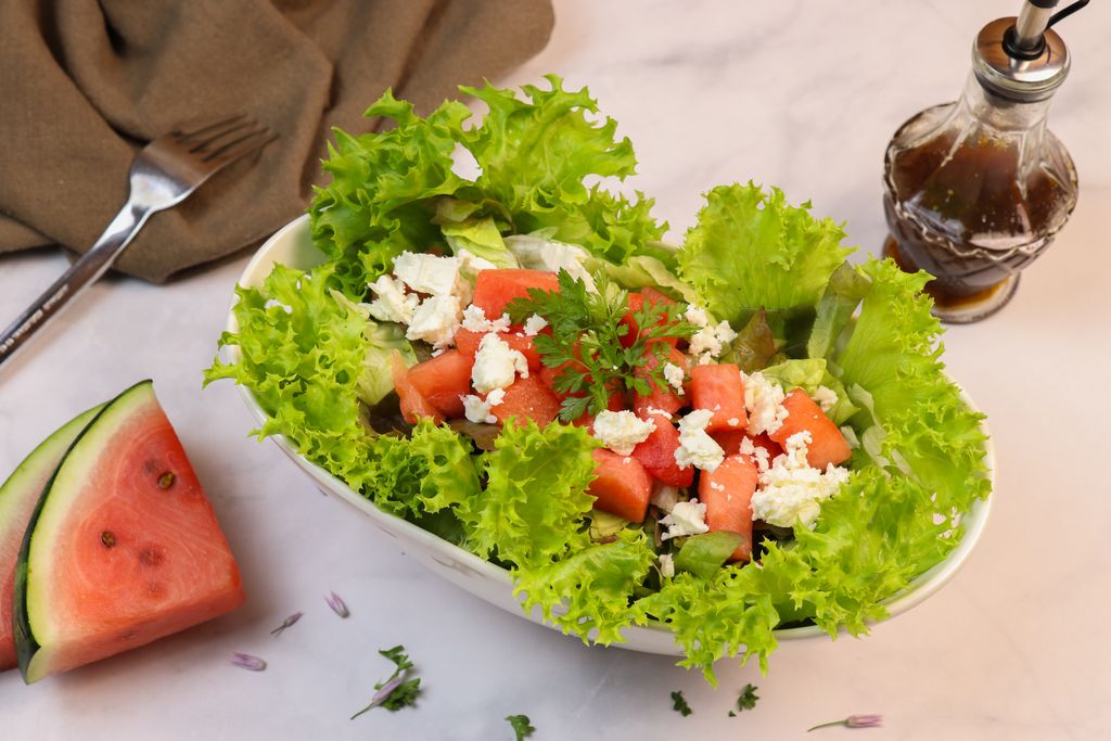 Zerteile und wasche den Eisbergsalat und schneide ihn anschließend in Streifen. Gib den Salat in eine große Schüssel. Wasche den Pflücksalat und gib ihn ebenfalls in die Schüssel. Schäle die Wassermelone, entferne die größeren Kerne, schneide sie in kleine Würfel und gib sie zu den Salaten. Rühre alles vorsichtig durch.